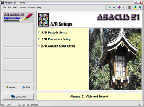 A/R Charge Codes are used when performing A/R Transactions Entry -- basically a BackOffice method of applying Charges or Adjustments (Debit Memos and Credit Memos).