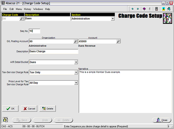 Sequence No. - Assign a Sequence No. for this Charge (amidst potentially others -- since it is possible to create a Charge Code that encompasses multiple Accounts... see example below).