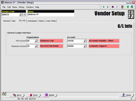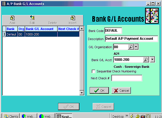 The appropriate Accounts must be added for General Ledger posting. This will define the default G/L Organizations and Accounts for the standard A/P Journal Entries that are created as a result of processing.