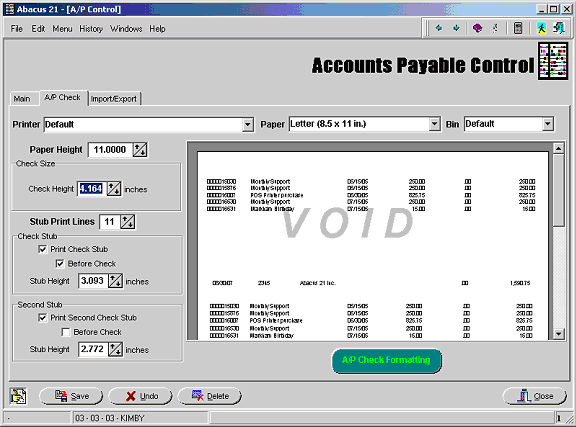 To get back to square one, simply delete (or rename) the APCHECK.rtm file in the Abacus\Programs\ folder. The next time into A/P control, the format will default to 'standard'.