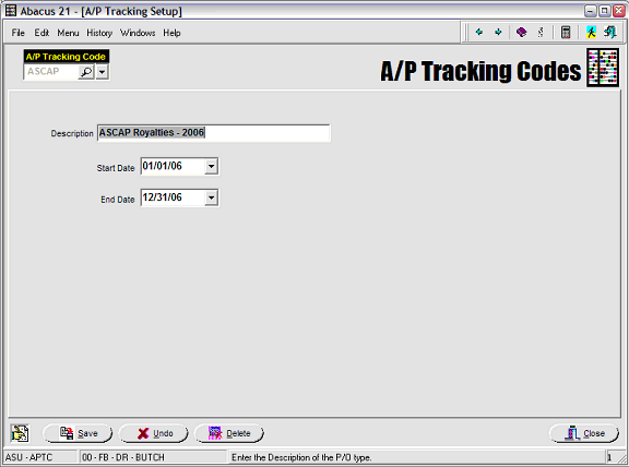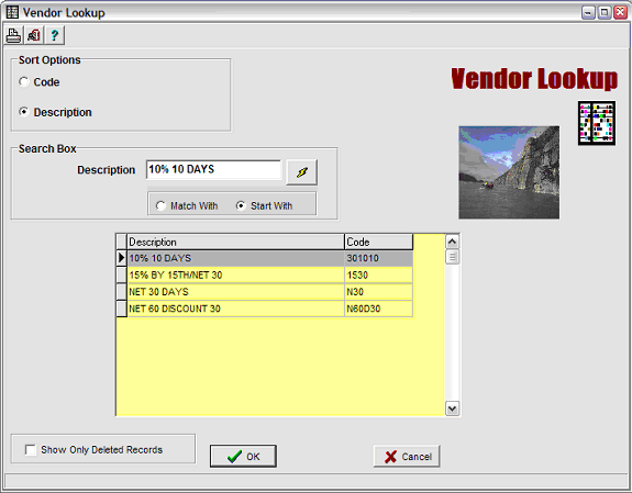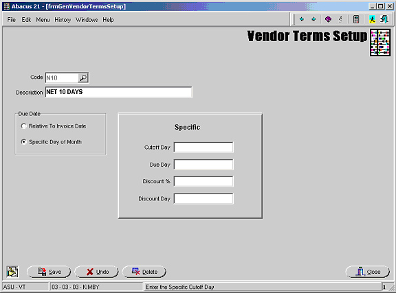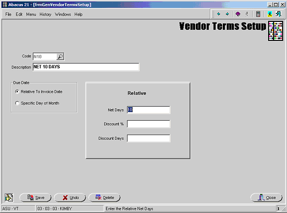 This option allows the user to define individual Terms Codes so that within the A/P Vendor Invoice Entry they may be associated with specific Vendors and Invoices.