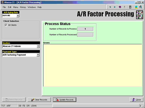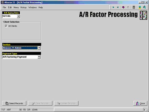 This description is intended to provide the setup information necessary for using the A/R Factoring process within Abacus 21 System 441 software.