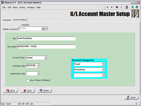 In this example, the Food Inventory Account is noted as being associated with the Account Categories 'Food' and 'Inventory'.