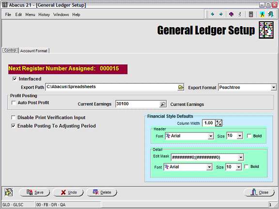 The screen below shows typical settings for the 'Control' aspects of the General Ledger System:
