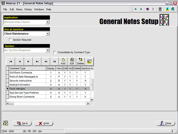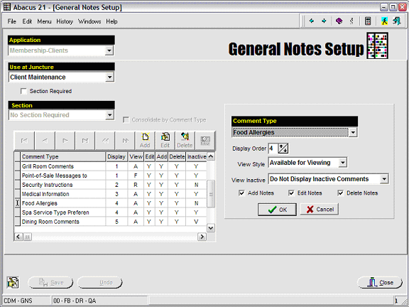 The following screen shows several Comment Types activated for the 'Client Maintenance' Juncture within the 'Membership-Clients' application: