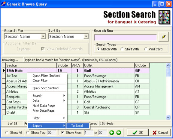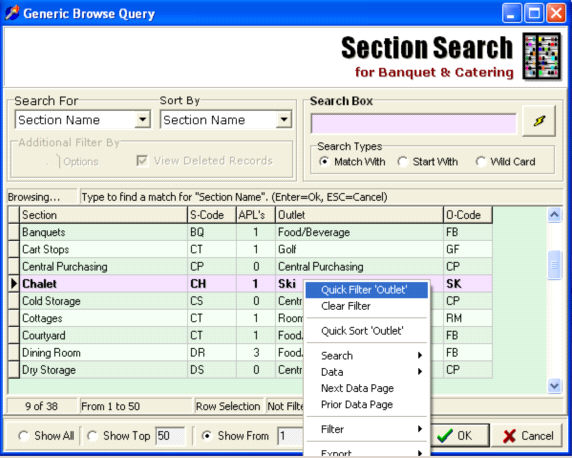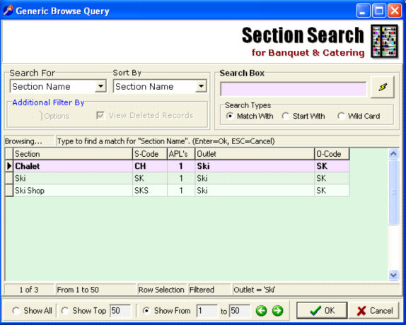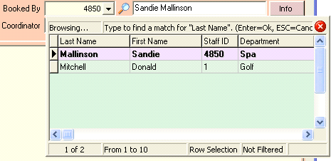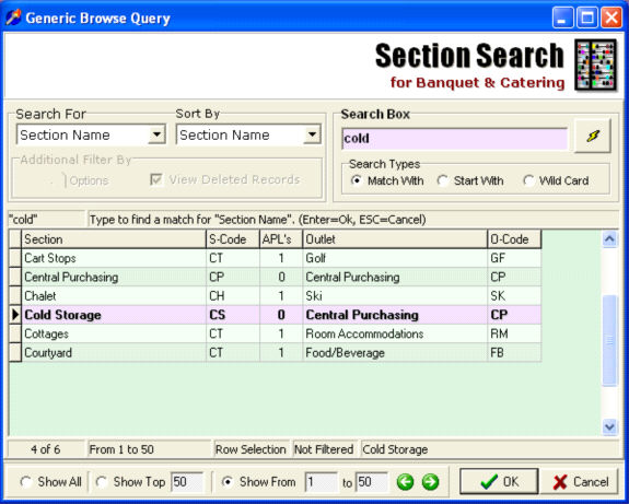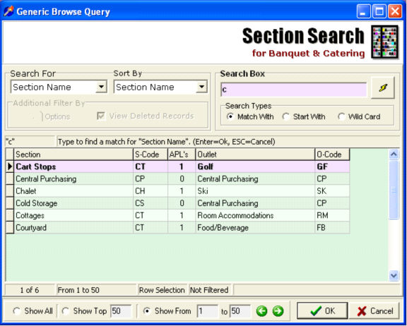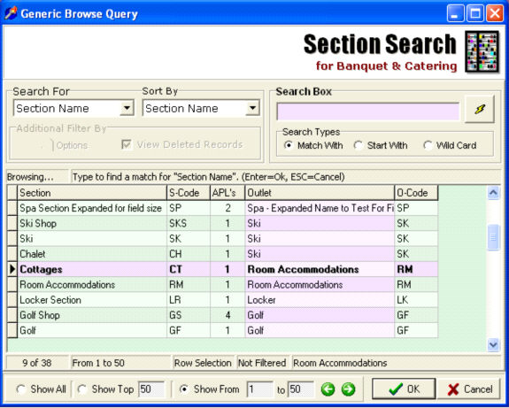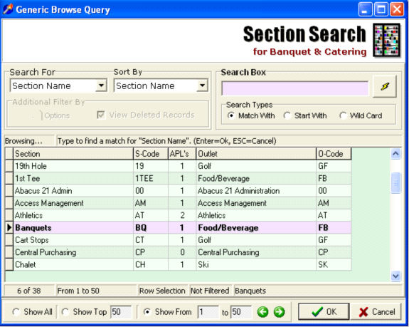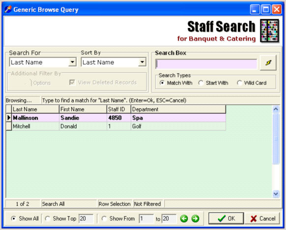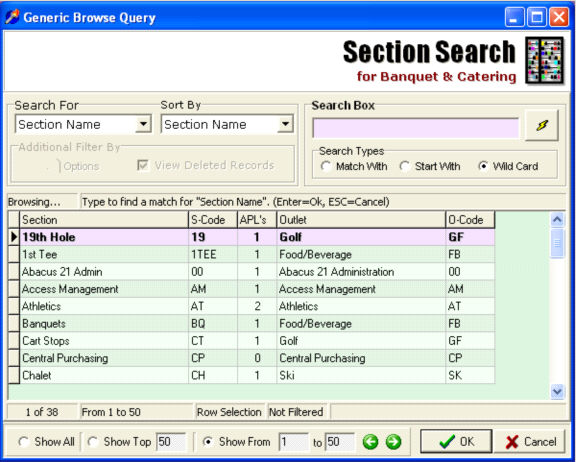 From here you can use the Mouse or Keyboard Arrow Keys to select the records desired. If you continue to type the Incremental Search will begin and attempt to find what you are looking for. Once the desired record is selected click OK, or press the Enter Key, to confirm your selection. Clicking Cancel or pressing the ESC (Escape) key will cancel the search.