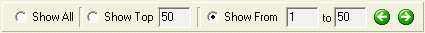 Show From X to Y – Will display pages of information with a limited number of records, similar to the Top Mode, however you can navigate to additional pages of records by using the next and prior buttons. If you have more than one page of information you can use the green arrows (or keyboard arrow keys) to navigate between the different pages of information. This mode is similar to searches performed on the Internet and is the most efficient for data retrieval when browsing large sets of results. For example: