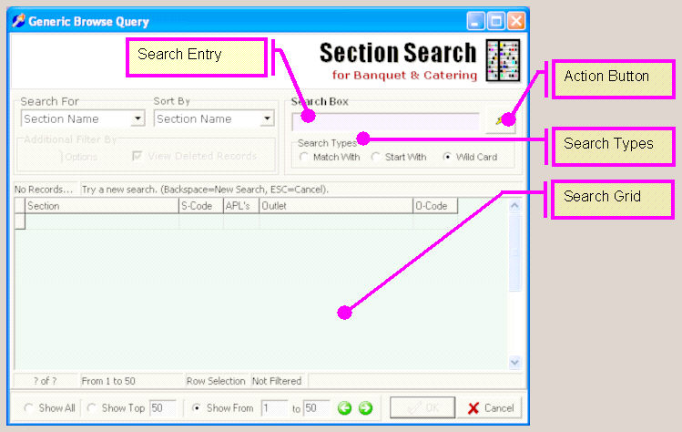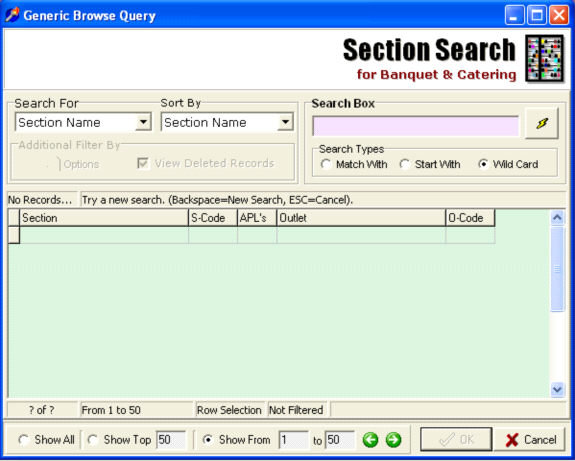 Wild Card – All records where the data partially matches the text in the search entry are returned. This is the slowest of all the searches. The Wildcard character is '*'.