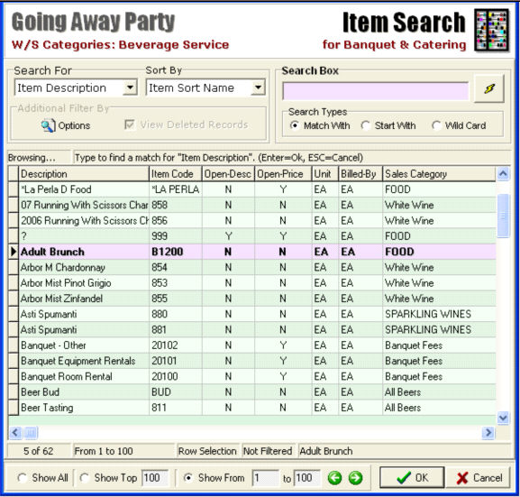 For Item Searches, Banquet & Catering will prompt for additional information:
