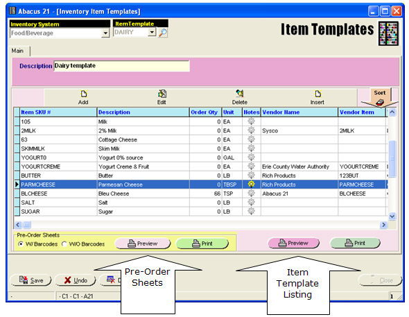 Item Templates now provide a convenient tool to Users -- by presetting the Inventory into easy-to-understand smaller subsets, the User is now prompted for Items in a standardized-convenient order and grouping. Used with Pre-Order Sheets (and perhaps providing translations), the Templates serve to ease the search for individual Items within the Requisition [as Requisition Templates] and Purchasing [as Ordering Templates] Systems.