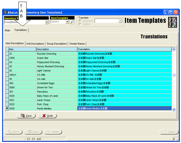 All translations are maintained by the User, and because the Item Templates are the genesis of translation capabilities, the translation tables are made available directly within the Item Template program, via a 'Translations’ tab: