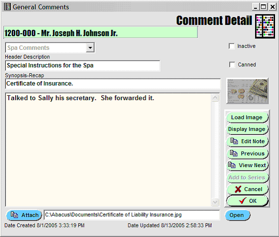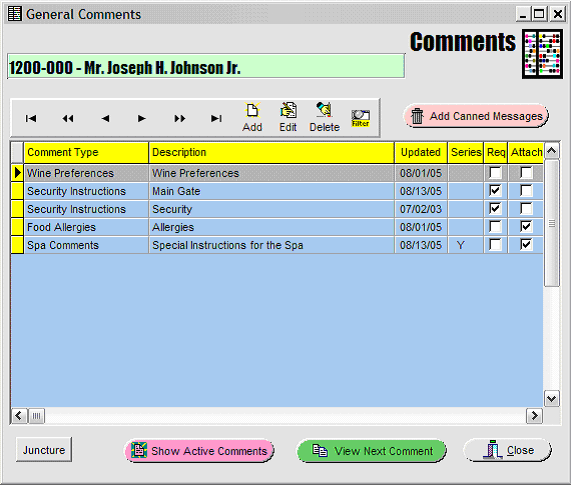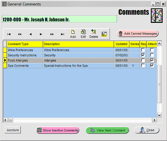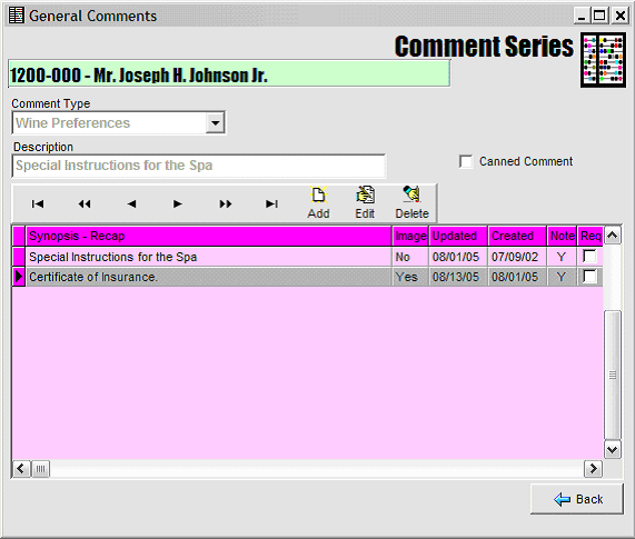 Note that in the display Grid of Comments above that there is a 'Y' in the Series column associated with Spa Comments -- meaning there is more than one (sub) Comment -- that is, a Series.
