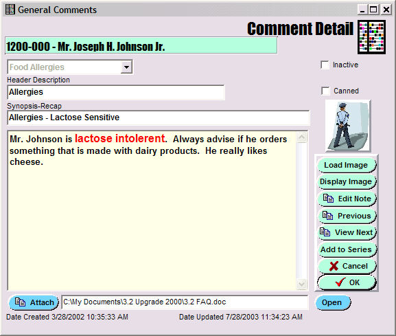 Selecting the 'Food Allergies' Comment Type (by double-clicking the Comment Line or highlight it and hitting the Edit button on the Navigation bar) expands to: