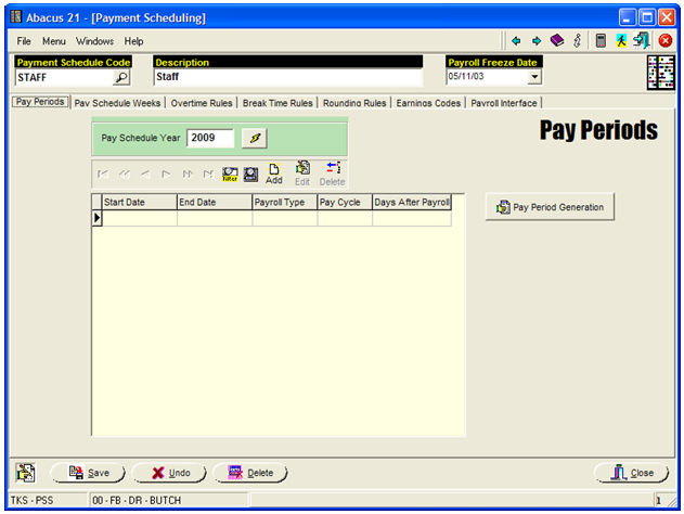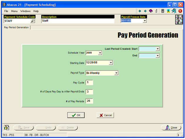 To create a new series of Pay Periods, hit the 'Generation' Button in the above screen... and you will get: