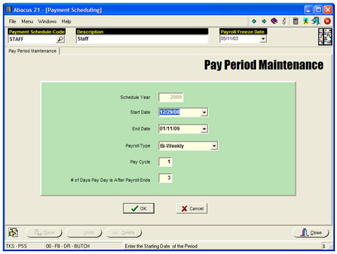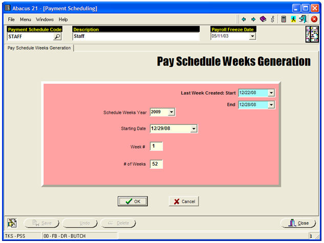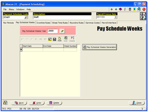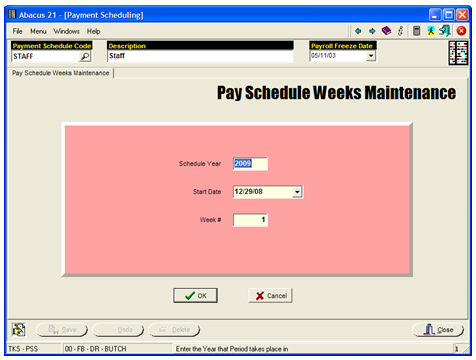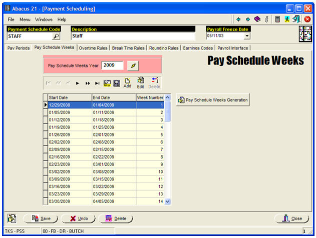 The above screen will 'number' the Weeks for Pay-Year 2009... and is primarily used for delineating Week definitions for the Timekeeping.