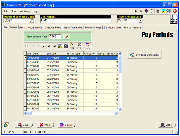 The above Pay-Period Generation creates twenty-six (26) Bi-Weekly Pay-Periods start with Monday, December 29, 2008... and indicates that the Payroll is actually paid three (3) Business-Days after the Pay-Period ends: