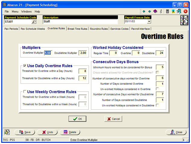 Establish the Regular & Overtime Rules using appropriate settings for you situation -- similar the above example's parameters.