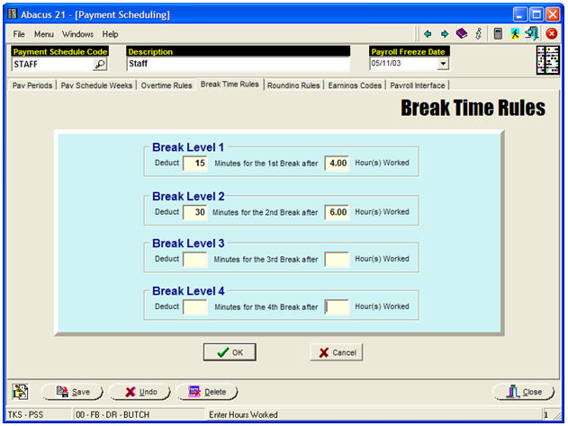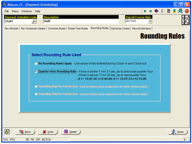 This segment of setups defines the Pay Cycles, Pay Weeks, Regular-Overtime Definitions, etc. within the Timekeeping System.