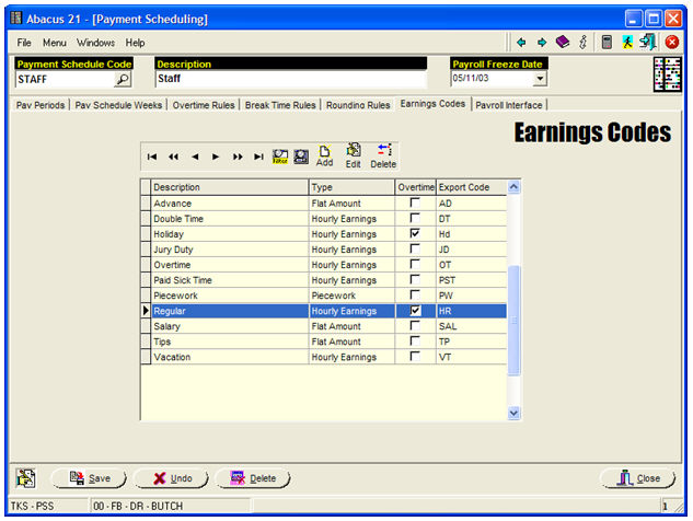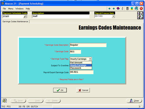 Note that this is the screen where you indicate the mapping from Abacus 21's Timekeeping Earnings Codes to the equivalent 3rd-Party Payroll System's Earnings Codes.
