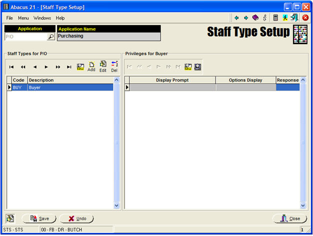 Under Staff Type Setup, within the P/O (Purchasing) Application, there is Staff-Type defined: