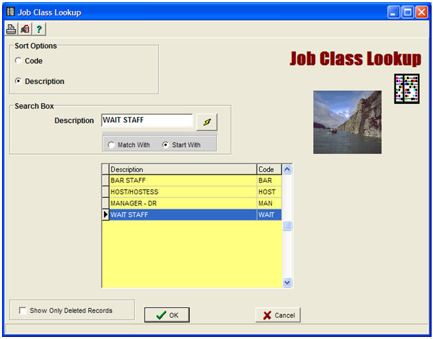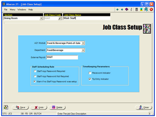 Below is an example of the Job Class "Wait Staff" set up within the Dining Room Section: