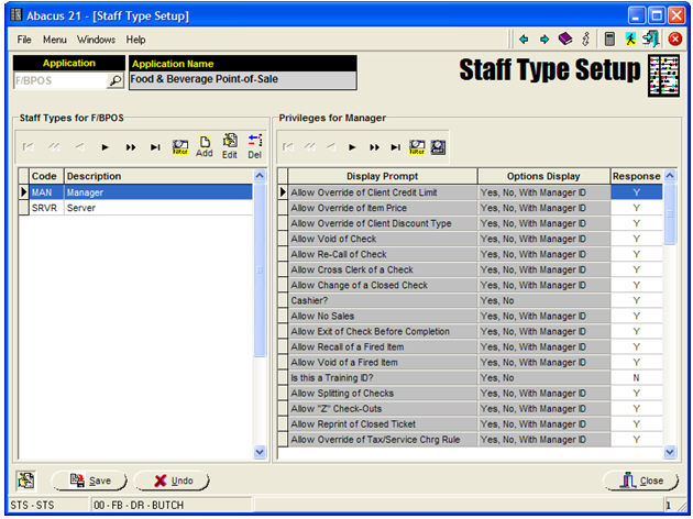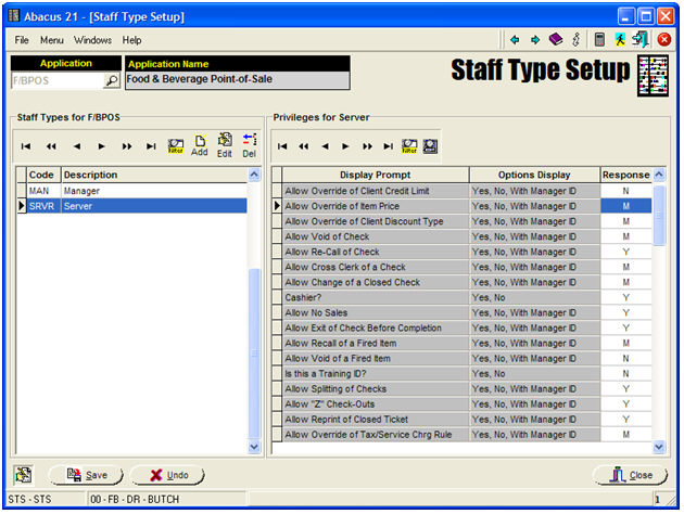 Below is an example of the Staff Types that have been created within the F/BPOS (Food & Beverage Point-of-Sale) Application Module: