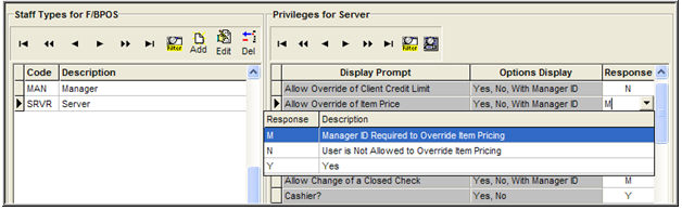 Notice that in the above examples that the Manager's Type includes almost across-the-board 'Yes' privileges... whereas the Server's Type has a mixture of Y, N, and M classifications.