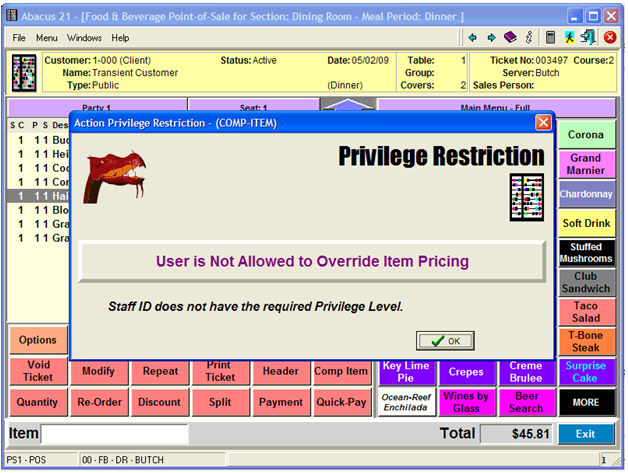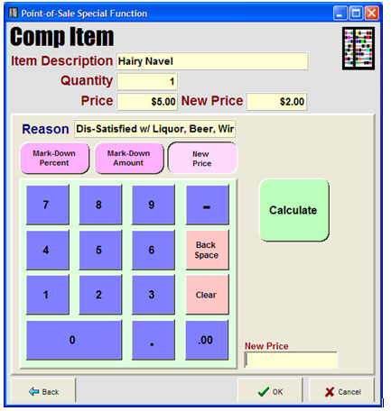 If the Privilege for "Allow Override of Item Price" is 'Y', they will be allowed to do the 'Comp' Price Change (after having provided an appropriate Reason) -- in this case lowering the Price from $5.00 to $2.00 (due to the fact that the Customer was Dis-Satisfied with the Liquor-Beer-Wine-Cocktail... undoubted because it didn't include sufficient Navel-Hair !!!):