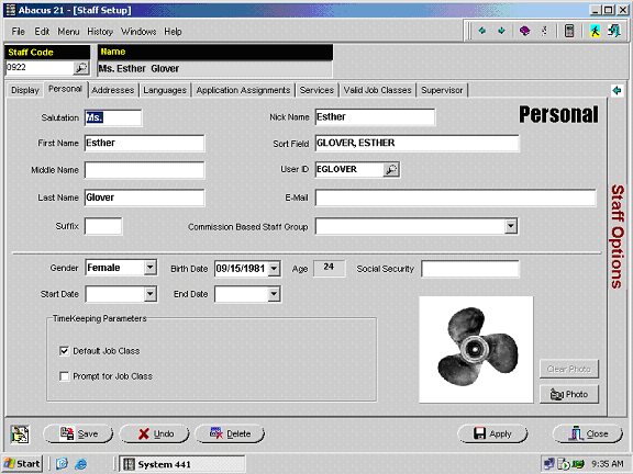 The following screen shows how (within Staff Setup, on the Personal Tab) a User ID is associated with the Staff Code.