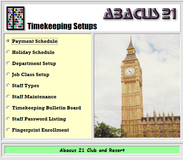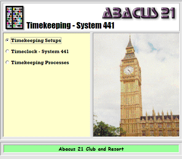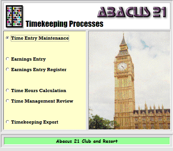 Abacus 21's Timeclock System (Timekeeping System) is one of several personnel-related systems:
