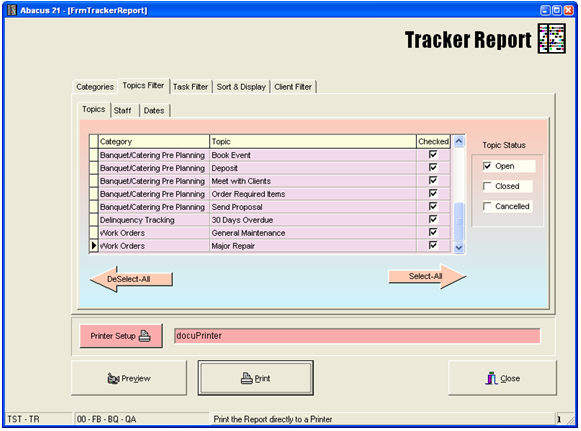 Within the selected Categories, select which Topic(s) are to be included -- and which Topic-Statuses (Open, Closed, Cancelled) are to be included.