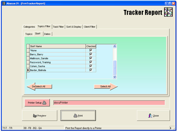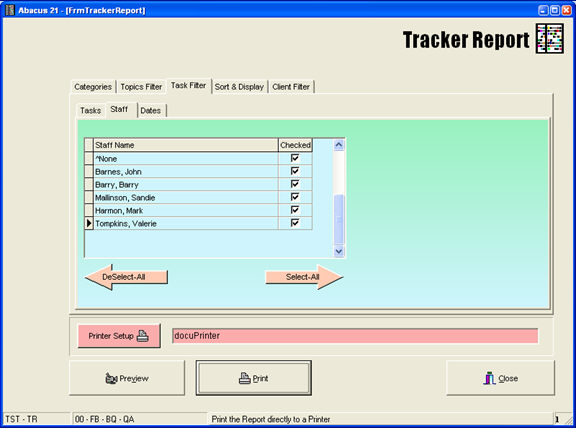 Tracker Tasks (inclusive of assigned Staff filters and Date filters at the Task level)