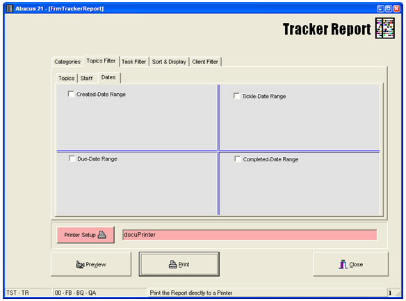 Four sets of Date-Types can contribute to the filtering of Topics within the Tracker Report: