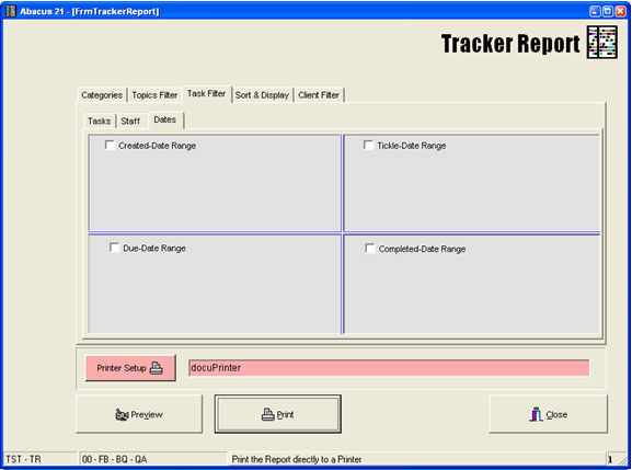 Then, regarding the Dates, one of the Date-Types (Created-Date, Tickle-Date, Due-Date, Completed-Date) can be selected to be the (single) Date Type for the Report to sort upon.