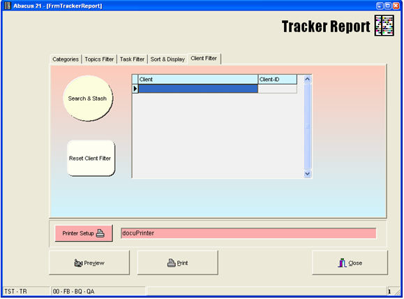 A series of Client-IDs and/or Names can be entered.... or the User can utilize the 'Search & Stash' option of the Client Topical Selector to establish a 'List of Clients' which to involve in the Tracker Report for additional Client-specific filtering: